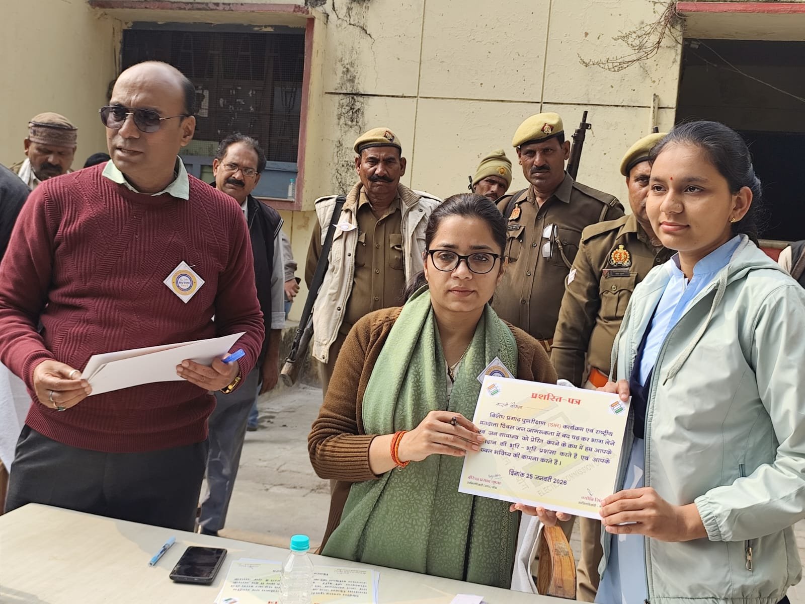 कोंच (जालौन) तहसील परिसर में दिन रविवार को राष्ट्रीय मतदाता दिवस की अवसर पर मतदाता जागरूकता कार्यक्रम का आयोजन यूपी जिला अधिकारी ज्योति सिंह एवं प्रभारी तहसीलदार वीरेंद्र प्रसाद गुप्ता की उपस्थिति में किया गया जिसमें एस आई आर में सहयोगियों को सम्मानित करते हुए प्रमाणपत्र दिए गए।