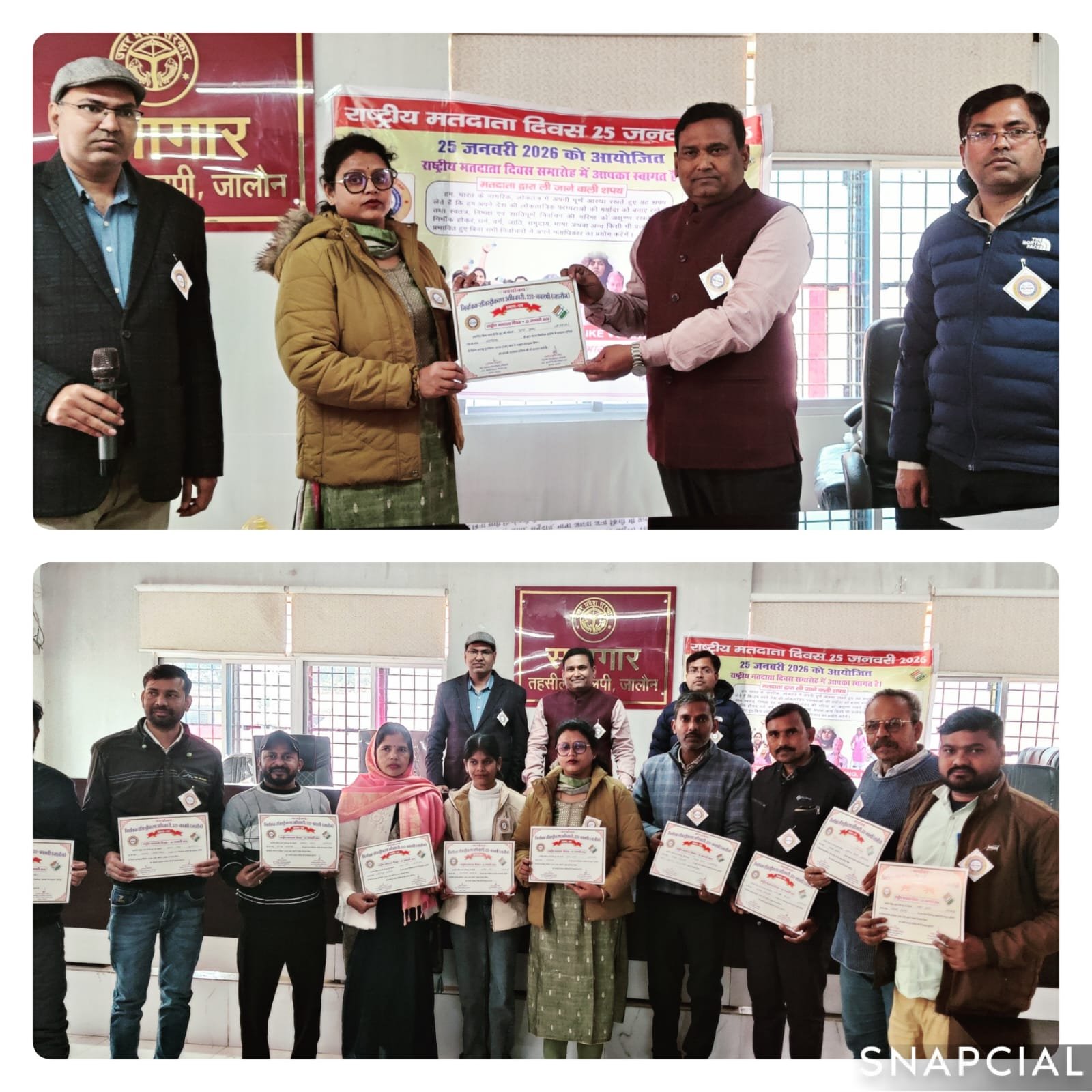 तहसील सभागार में कार्यक्रम का आयोजन किया गया। निर्वाचन आयोग द्वारा संचालित विशेष प्रगाढ पुनरीक्षण (SIR) अभियान में उत्कृष्ट प्रदर्शन करने वाले बीएलओ सीमा देवी, कृष्णा कुमारी, अनिता देवी, हरिशरण कुशवाहा, पूनम पुरवार, राकेश कुमार तथा सुपरवाइजर सोमचन्द त्रिपाठी, प्रियंक कुमार व प्रशांत गौतम तथा मतदाता पंजीकरण केंद्र प्रभारी शशांक कुमार विश्वकर्मा व कम्प्यूटर ऑपरेटर नितिन कुलश्रेष्ठ को उपजिलाधिकारी कालपी मनोज कुमार सिंह द्वारा प्रशस्ति पत्र प्रदान किये गये। कार्यक्रम में तहसीलदार कालपी अभिनव तिवारी, नायब तहसीलदार मुकेश कुमार सहित राजस्व कर्मचारी व डिस्ट्रिक्ट प्रेस क्लब कालपी तहसील अध्यक्ष सलीम अंसारी, नगर अध्यक्ष दीपचंद्र सैनी, महामंत्री अमित यादव, अश्विनी निषाद के अलावा गणमान्य नागरिक उपस्थित रहे। तहसीलदार अभिनव कुमार तिवारी ने मतदाता दिवस के महत्व व थीम पे चर्चा की। उपजिलाधिकारी मनोज कुमार सिंह द्वारा सभी लोगों को मतदाता दिवस की शपथ दिलाई गई तथा सभी मतदाताओं को वोट देने के लिये प्रेरित किया गया।