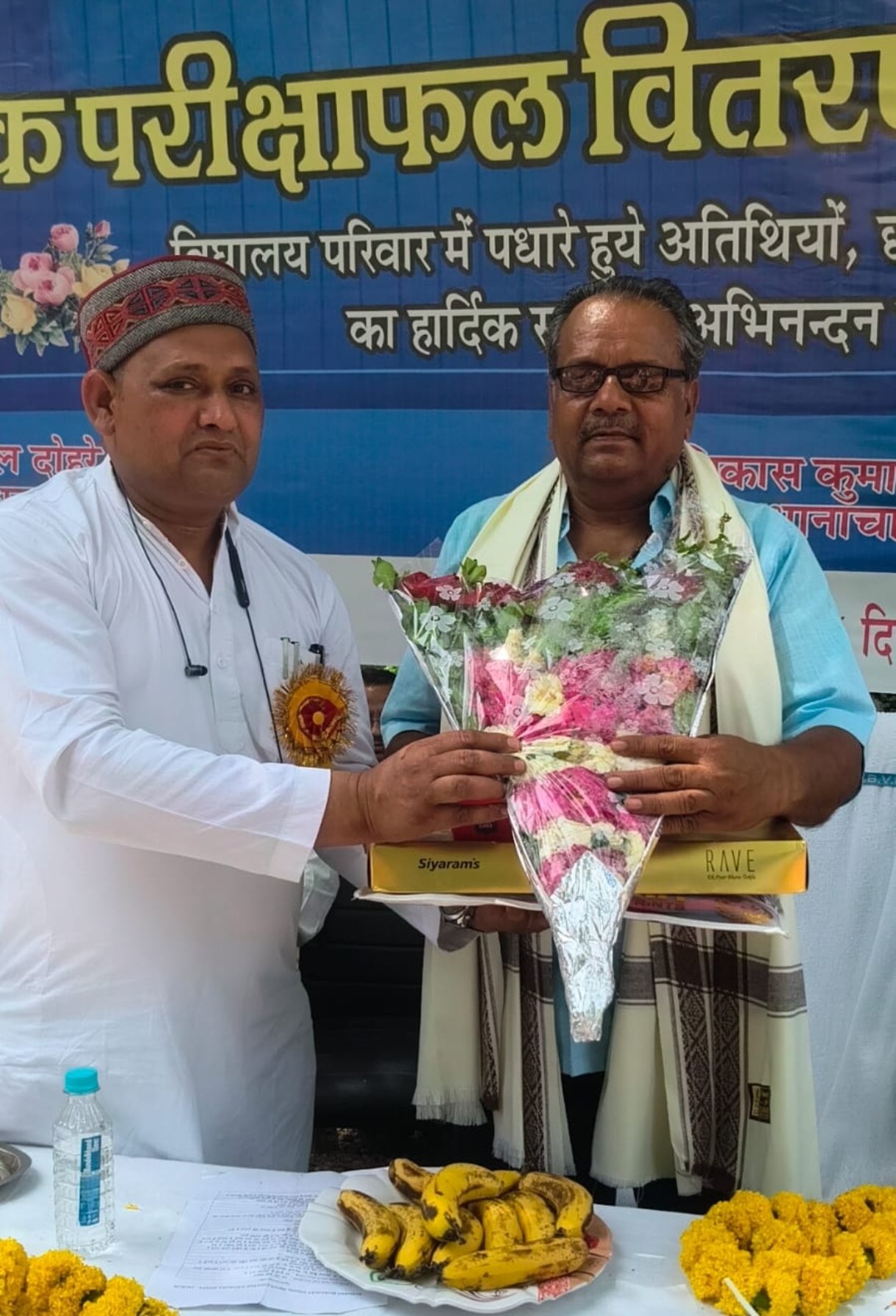 आज दिनांक 3 अप्रैल 2026 दिन शुक्रवार को महंत भगवत विशाल इंटर कॉलेज कदौरा जनपद जालौन में कक्षा 6 से 8 ,9 एवं 11 के छात्र छात्राओं का परीक्षा परिणाम मुख्य अतिथि प्रदीप सिंह चौहान बाबू Ramadheen समाज सेवक यशोधरा चौधरी समाजसेvika एवं अन्य अतिथियों के द्वारा विद्यालय के प्रधानाचार्य विकास कुमार सिंह द्वारा मां सरस्वती के चित्र पर दीप प्रज्वलित कraकर भगवान बुद्ध को श्रद्धा सुमन अर्पित करते हुए संविधान निर्माता डॉक्टर भीमराव अंबेडकर जी के चित्र पर माल्यार्पण पुष्पांजलि एवं दीप प्रज्वलित करते हुए प्रारंभ किया गया परीक्षा परिणाम पकर छात्र-छात्राओं के चेहरे खिलखिला उठे एक कक्षा में तीन छात्र-छात्राओं द्वारा प्रथम द्वितीय एवं तृतीय स्थान प्राप्त किए गए विद्यालय के प्रधानाचार्य विकास कुमार सिंह द्वारा सभी प्रथम द्वितीय एवं तृतीय स्थान प्राप्त करने वाले chhatr छात्राओं को उपहार देकर सम्मानित किया गया आए हुए अतिथियों द्वारा भी सभी बच्चों को आशीर्वाद और भविष्य में आगे बढ़ाने के लिए प्रेरित किया गया परीक्षा फल वितरण के उपरांत राष्ट्रीय शैक्षिक महासंघ के जिला अध्यक्ष प्रदीप सिंह चौहान प्रधानाध्यापक उच्च प्राथमिक विद्यालय कthपूर्वा का सेवानिवृत्ति सम्मान समारोह किया गया जिसमें विद्यालय के प्रधानाचार्य विकास कुमार सिंह द्वारा शाल अंग वस्त्र मिष्ठान एवं श्रीफल देकर सम्मानित किया तथा विद्यालय के अन्य शिक्षक शिक्षिकाओं एवं कर्मचारियों एवं बच्चों द्वारा उन्हें उपहार देकर भी सम्मानित किया गया श्री प्रदीप सिंह चौहान द्वारा अपने आशीर्वचनों में कहा गया कि इस विद्यालय के प्रधानाचार्य द्वारा मुझे जो यह सम्मान दिया जा रहा है मुझे बहुत अच्छा लगा।