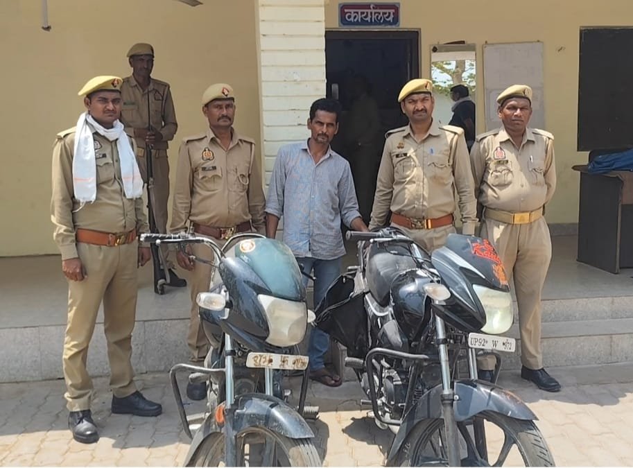 कोंच (जालौन) कोतवाली पुलिस में चोरी की वारदात का खुलासा करते हुए बताया कि मुखबिर की सूचना पर उप निरीक्षक नितेश कुमार अभिषेक सिंह और कांस्टेबल अभिषेक पाल मोटरसाइकिल चोर की गिरफ्तारी हेतु बताए स्थान पर पहुंच गए जिसमें जालौन रोड से नदी गांव की ओर चोर की जाने की सूचना दी गई वहीं सूचना को गंभीरता से लेते हुए पुलिस टीम पंचानन चौराहे से लौना रोड स्थित पुलिया के पास झाड़ियां में छुपकर संदिग्ध का इंतजार करने लगी और जैसे ही एक व्यक्ति मोटरसाइकिल से आता हुआ दिखाई दिया तो उसे दविस देकर रोक लिया और जब उसे नाम पूछा गया तो उसने अपना नाम श्री प्रकाश पुत्र स्व लल्लूराम निबासी ग्राम अंडा बताया जिसकी निशानदेही पर पेंशन प्रो यू पी 92 डब्ल्यू 9729 ए डी 0823 की दो मोटर साइकिलें बरामद हुईं जिसे पकड़कर पुलिस कोतवाली ले आई जहां पर मुकद्दमा संख्या 75/26 धारा 303(2)/317(2)/बी एन एस में दर्ज कर विधिक कार्यवाही की।